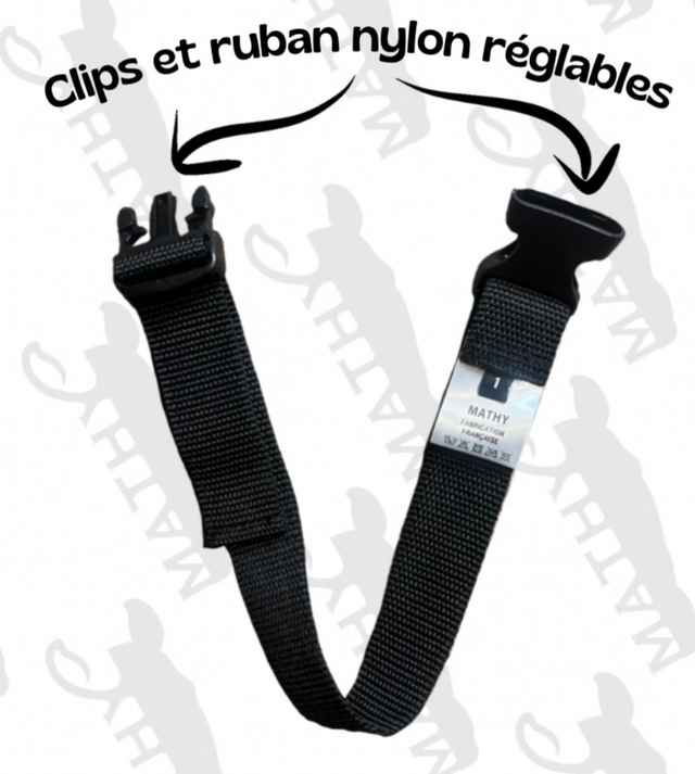 4. Attention : 2 ceintures nylon sont nécessaires pour faire le tour du corps, ou 1 ceinture + 1 pochettes MATHY parmi les modèles disponibles.
